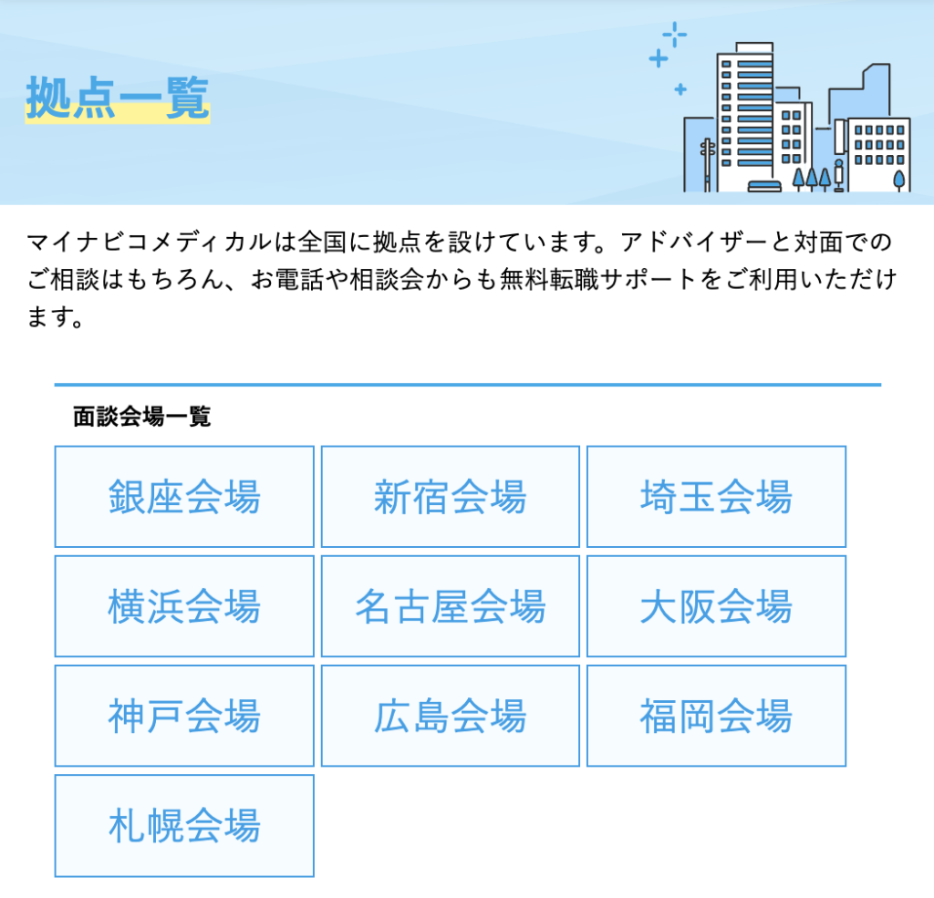 当然マイナビコメディカルのユーザーもそれらの拠点を利用できるので、転職支援は対面で受けたい!という言語聴覚士さんには非常にオススメの転職サイトとなっています。